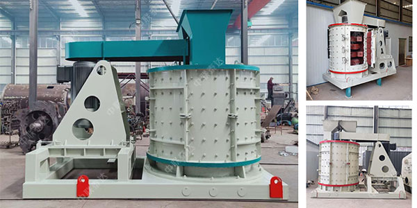 物料由機器上部垂直落入高速旋轉的葉輪內(nèi),在高速離心力的作用下,與另一部分以傘狀形式分流在葉輪四周的物料產(chǎn)生高速撞擊與粉碎,物料在互相撞擊后,又會在葉輪和機殼之間以物料形成渦流多次的互相撞擊、摩擦而粉碎,從下部直通排出,形成閉路多次循環(huán),由篩分設備控制達到所要求的成品粒度。