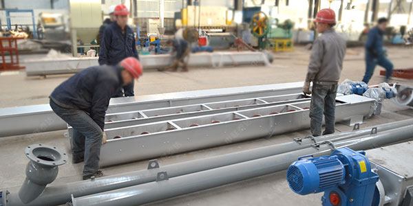 螺旋輸送機的工作原理是旋轉(zhuǎn)的螺旋葉片將物料推移而進行螺旋輸送機輸送,使物料不與螺旋輸送機葉片一起旋轉(zhuǎn)的力是物料自身重量和螺旋輸送機機殼對物料的摩擦阻力。螺旋輸送機旋轉(zhuǎn)軸上焊的螺旋葉片,葉片的面型根據(jù)輸送物料的不同有實體面型、帶式面型、葉片面型等型式。螺旋輸送機的螺旋軸在物料運動方向的終端有止推軸承以隨物料給螺旋的軸向反力,在機長較長時,應(yīng)加中間吊掛軸承。